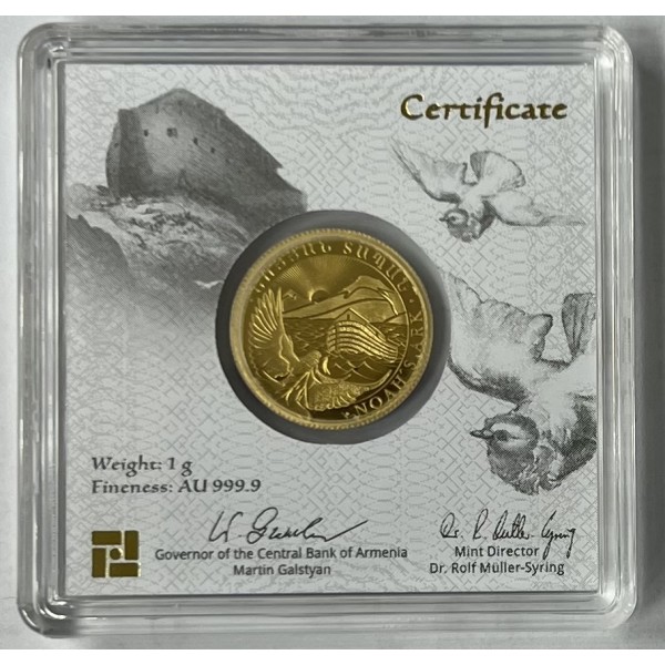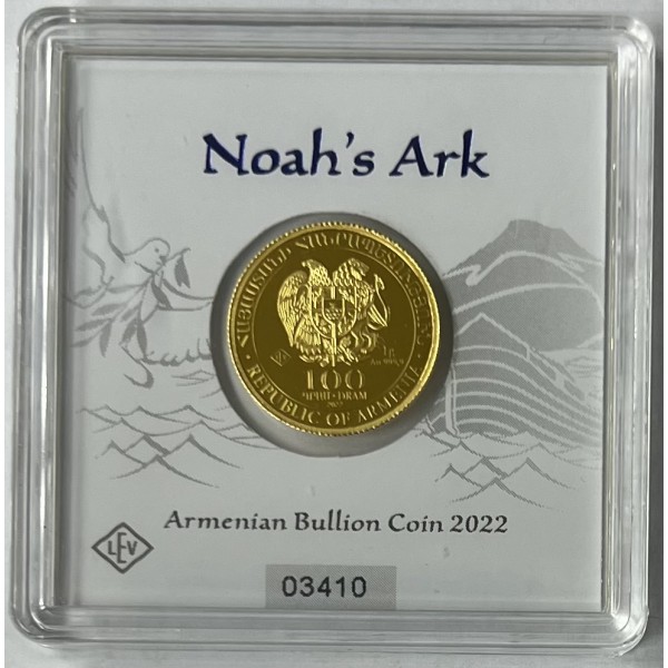 Seit September 2020 erscheint die Goldmünze Arche Noah aus Armenien erstmals als Anlagemünze in Stempelglanz. Die Geiger Edelmetalle AG besitzt das Prägerecht und produziert die Münze in Deutschland. Ausgeliefert wird sie in einer Sicherheitskapsel mit Echtheitszertifikat. Das Motiv zeigt das aus der Bibel bekannte Schiff in aufgewühlter See vor im Hintergrund verlaufenden Sonnenstrahlen über dem armenischen Gebirge Ararat.