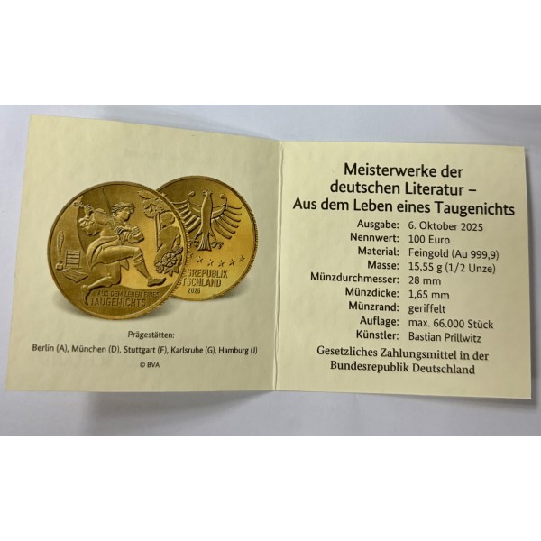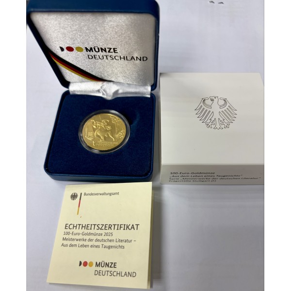 Nach dem Erfolg der Goldmark gab Deutschland 2002 erstmals eine 100 Euro Goldmünze mit 1/2 oz und eine 200-Euro-Münze mit 1 oz Gold heraus (Motiv: "Einführung des Euro/Währungsunion"). 2003-2019 gab es jährlich nur noch die 100-Euro-Münze mit 1/2 oz und Motiven von Unesco-Weltkulturerbestätten, die 2019 mit dem Motiv Dom zu Speyer endete. Es folgten aus der Serie "Säulen der Demokratie" die Motive Einigkeit 2020, Recht 2021, Freiheit 2022. Neue Motive der Serie "Meisterwerke der Literatur": Faust 2023, Der zerbrochne Krug 2024. Seit 2017 ist auch die Lutherrose 50 Euro 1/4 oz (7,78 g) anlässlich des Jubiläums 500 Jahre Reformation erhältlich. Weitere Serien: Deutscher Wald, Heimische Vögel, Musikinstrumente, Rückkehr der Wildtiere.