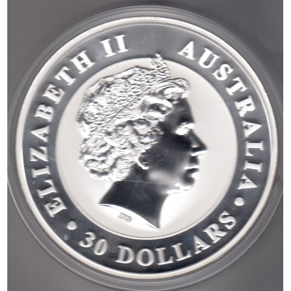 1 Kilo Silbermünze mit dem Wappenvogel Australiens , dem Kookaburra . Diese Münze hat den Nennwert von 30 australischen Dollars . Münze ist NEUWERTIG .