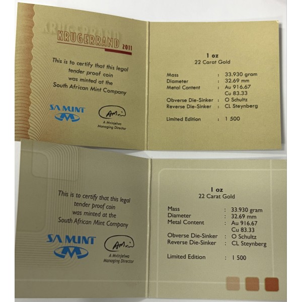 Auf der Vorderseite der Münze befindet sich das Portrait von Paul Kruger und die Schriftzüge Suid-Afrika und South Afrika. Auf der Rückseite ist das Nationaltier von Südafrika, die Springbock-Antilope, abgebildet. In geteilter Schreibweise ist links und rechts davon die Angabe des Prägejahres und am oberen Rand der Schriftzug Krugerrand eingeprägt. Am unteren Rand der Münze ist Fyngoud 1 oz fine Gold geprägt.